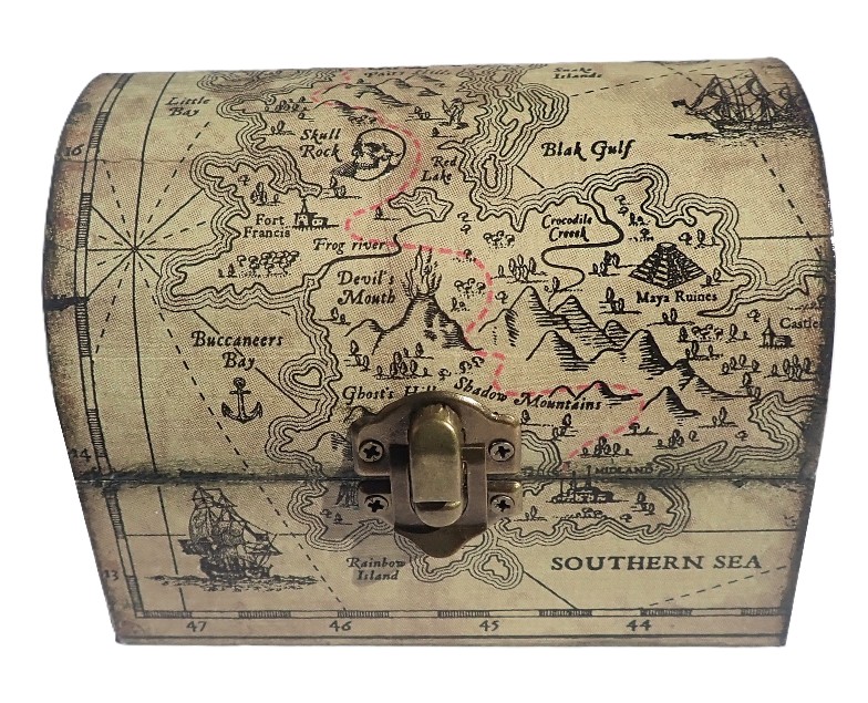 Dřevěné krabičky, truhličky pro kluky – DŘEVĚNÁ TRUHLIČKA NA POKLADY, PIRÁTSKÁ MAPA – kouzelné doplňky do dětského pokojíčku – kvalitní české výrobky