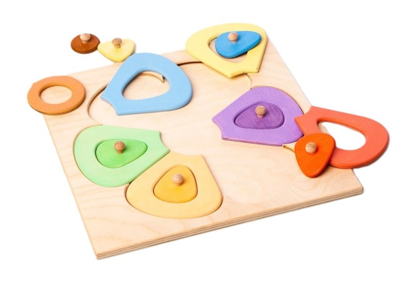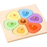 - Kytka……… nejen rozměrem, ale i určením. 5 druhů tvarů v 6 barvách a každá ve 3 odstínech. Děti mohou hledat stejné barvy a nebo skládat nepřeberné množství různých barevných variant. Zároveň cvičí jemnou motoriku prstíků a logiku pro vnímání velikostí a postupu skládání. Menší díly jsou vybavené dřevěnými „čudlíky“ pro snadné uchopení. Oproti menší ségře o mnoho víc možností barevných kombinací i skládání…