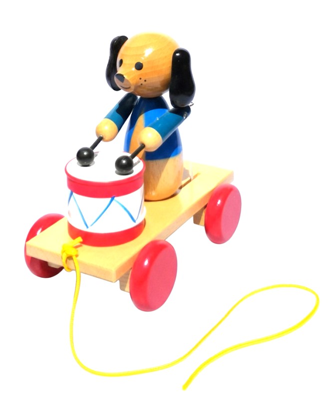 Wooden toys – WOODEN DOG WITH DRUM, COLOURED II. – wooden pulling out toys with drum – czech product