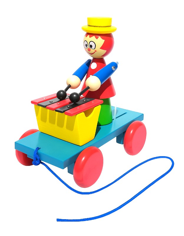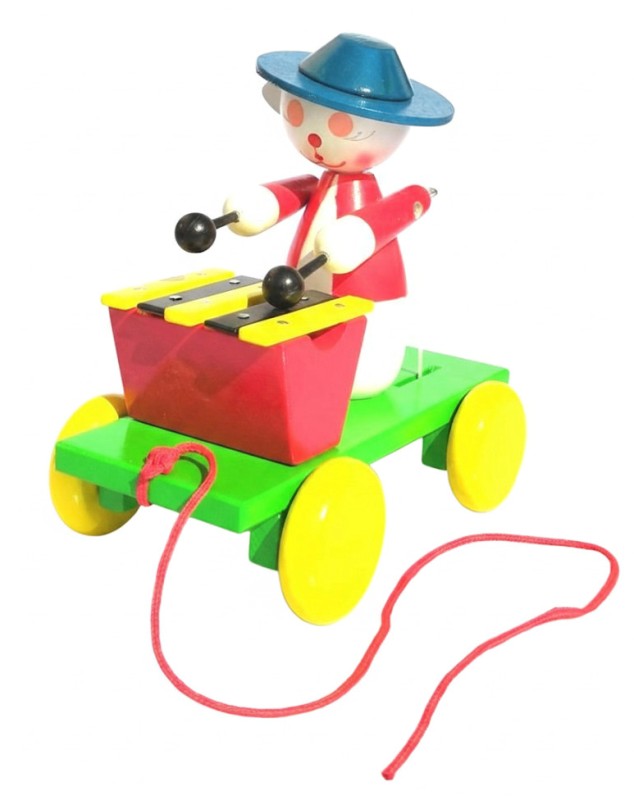 Wooden toys – WOODEN CLOWN WITH XYLOPHONE, COLOURED – wooden pulling out toys with xylophone – czech product