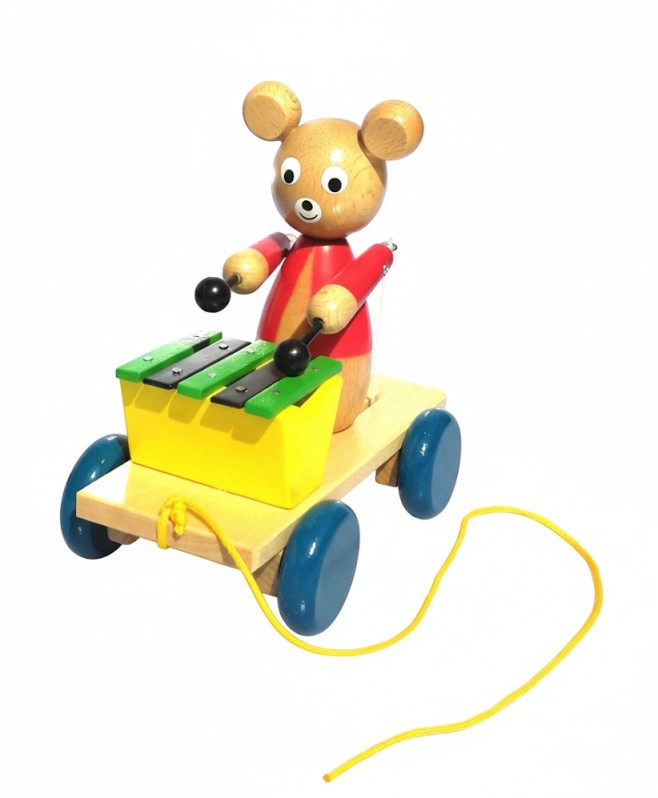 Wooden toys – WOODEN BEAR WITH XYLOPHONE, COLOURED – wooden pulling out toys with xylophone – czech product