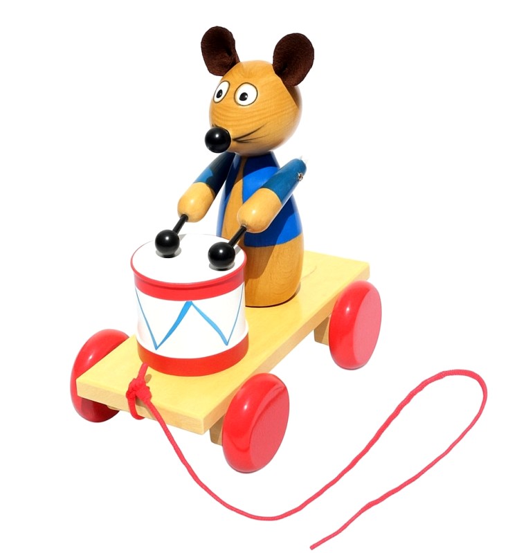 Wooden toys – WOODEN MOUSE WITH DRUM, COLOURED II. – wooden pulling out toys with drum – czech product