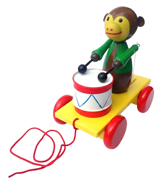 Wooden toys – WOODEN MONKEY WITH DRUM, COLOURED – wooden pulling out toys with drum – czech product
